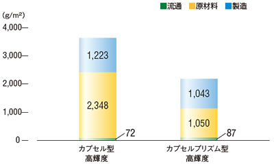 原材料、製造、流通時におけるCO2の排出量が1m2当たり、従来品:カプセルプリズム型高輝度反射シート(PV8200シリーズ)(約3.6kg)、当該品:カプセルプリズム型高輝度反射シート(PX8400シリーズ)(約2.2kg)となり、1m2当たりのCO2排出量が約1.4kg(約40%)、削減できました。